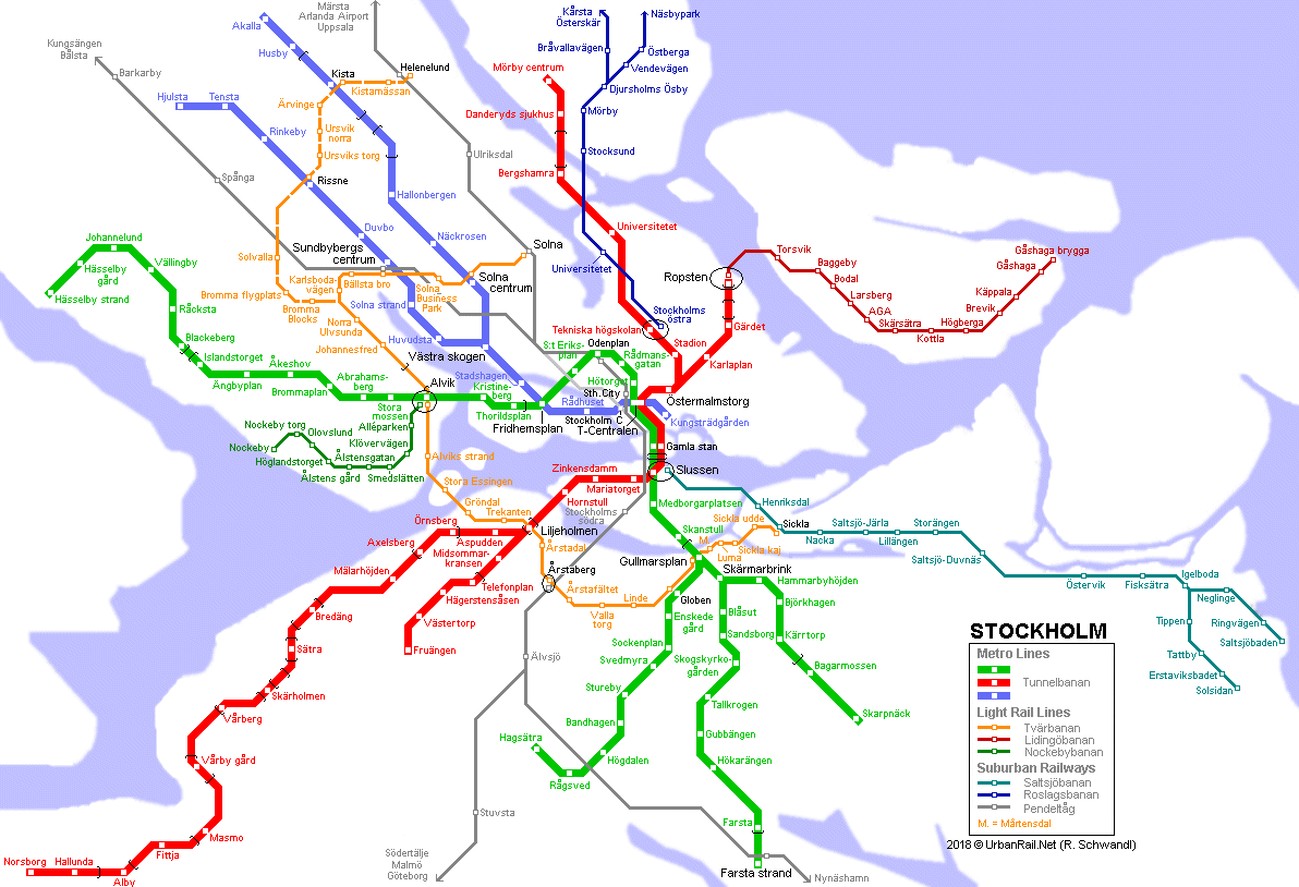 Najrýchlejší, a veľmi užitočný dopravný prostriedok vedúci z centra na predmestia je metro – Tunnelbana, alebo T-bana. Má tri trasy (červená, zelená, modrá). Stanice sú označené modrým písmenom „T“ na bielom podklade. Vlaky jazdia od skorých ranných hodín do polnoci (v piatok a v sobotu aj cez noc). Spoločnou stanicou všetkých liniek T-banu je T – Centralen pod hlavnou železničnou stanicou. Regionálne vlaky Pendeltågen odchádzajú z nástupísk na úrovni zeme. T –bana má dobrý umelecký dojem. Jednotlivé stanice sú umeleckými dielami. Napríklad T – Centralen je obrovská modrá jaskyňa, alebo stanica Kungsträdgården je plná sôch, svetiel a fontán.